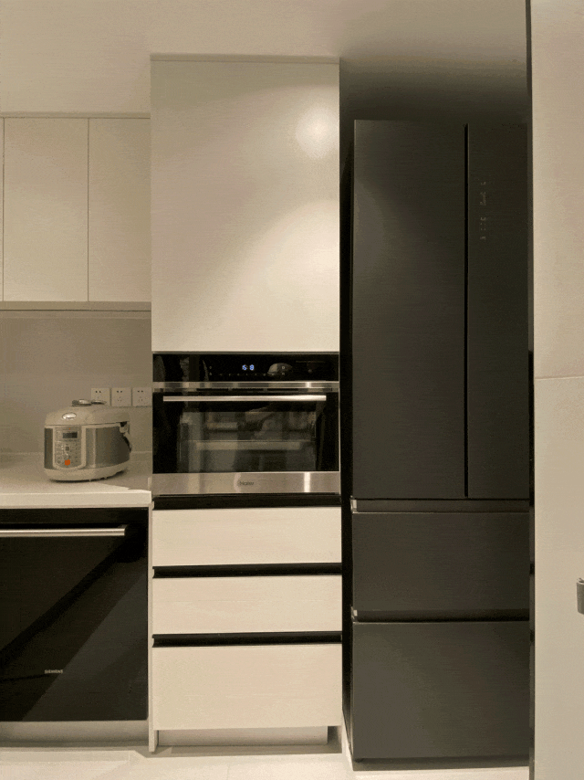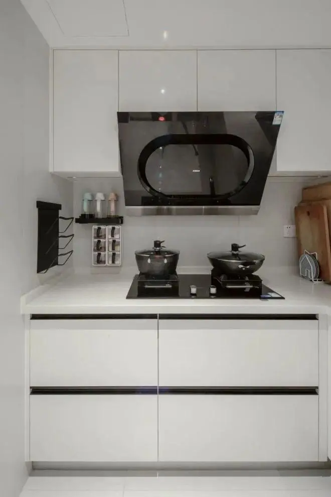 Some non-load-bearing walls were removed from the kitchen and some space was borrowed from the original living room, which doubled the kitchen area. The U-shaped cabinet is customized inside, which separates the dish preparation area from the cooking area, and follows the smooth moving line of “take-wash-cut-fry-serve” to make cooking easier.