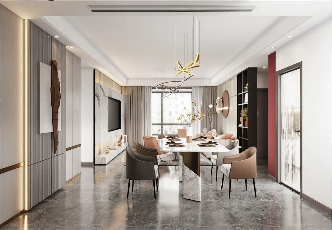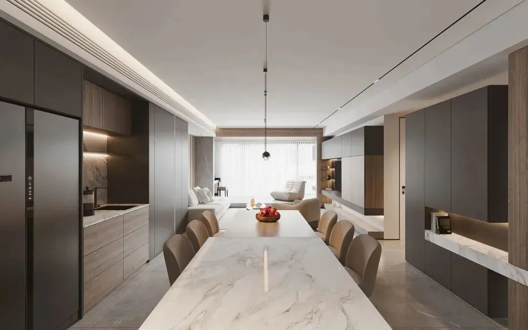 Customize the whole wall of TV cabinet and sideboard to create an integrated guest and dining room. This can not only improve the storage capacity of the dining room, but also visually extend the living room, making the small space appear more spacious.