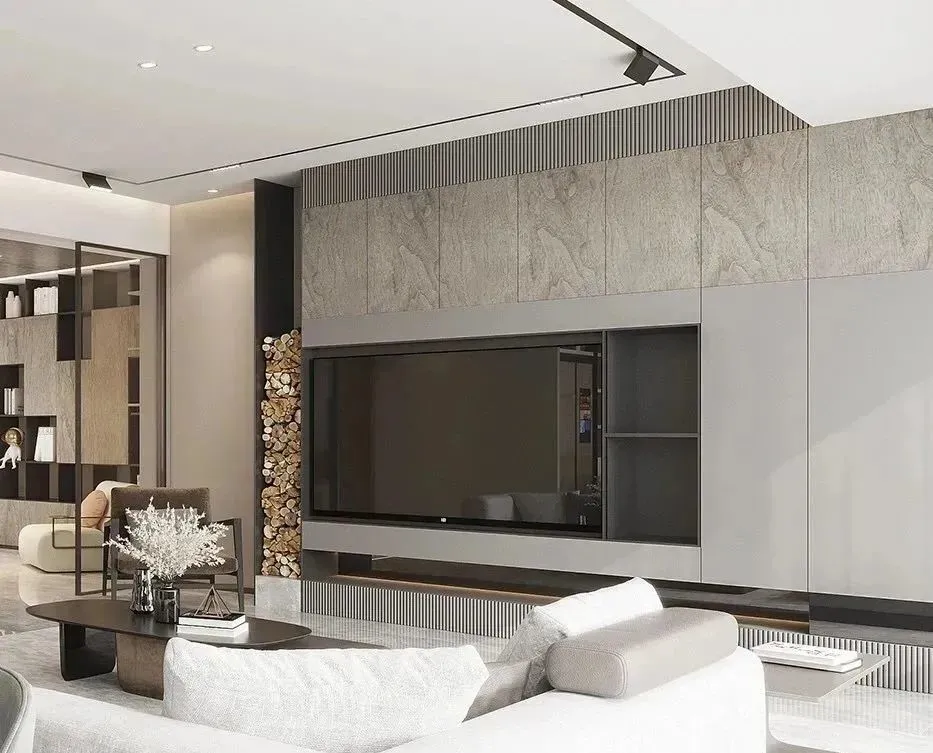 Nowadays, the frequency of TV use is getting lower and lower, so why bother to use a wall for complex shapes? Not only is it costly, but it is also easy to become obsolete. A simple wall makes the space fresher, or it can be made into a whole wall storage cabinet, which is more practical.