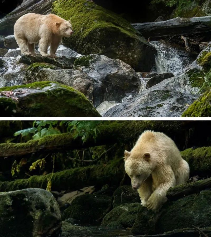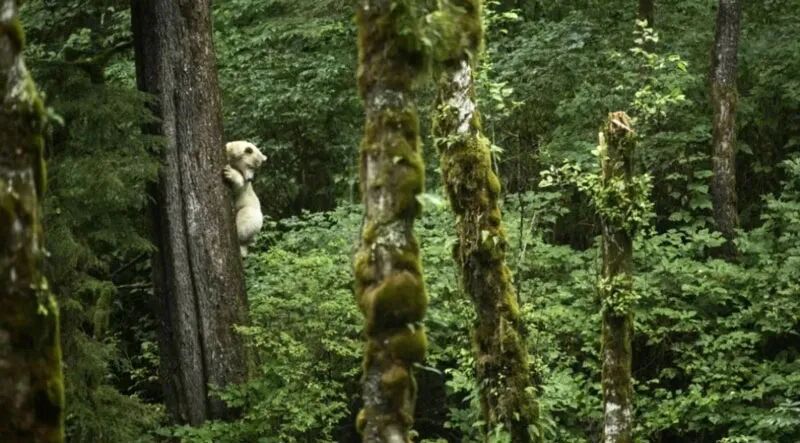 On the west coast of Canada, in British Columbia, next to the Pacific Ocean, there is a dense rainforest. The most special protagonist in the rainforest is the Comode Bear, which everyone prefers to call the White Spirit Bear. White spirit bear is actually a special variety of American black bear. They have white hair all over because of a rare invisible mutation in a gene called MCR 1, which must be carried by both parents. There are probably fewer than 400 all over the world right now.