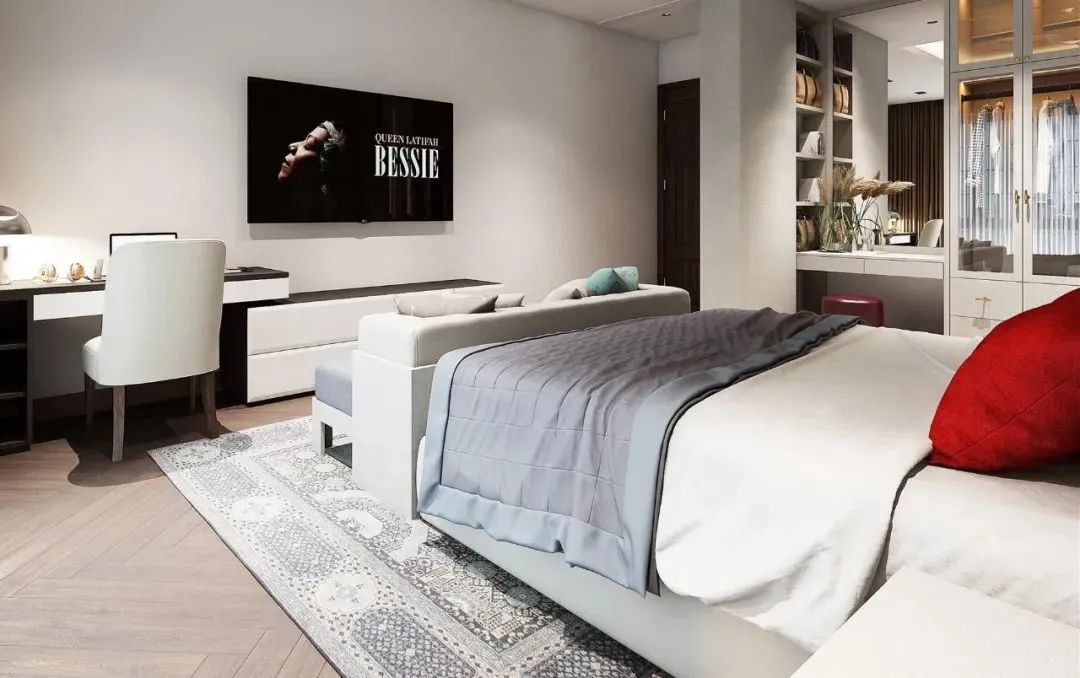 Similarly, when there is no wardrobe at the end of the bed, if the floor space is limited and the cabinet cannot be placed, you can choose to hang the TV on the wall. Nowadays, TVs are very thin and light, and wall-mounted installation takes up almost no space, which is very suitable for smaller bedrooms.