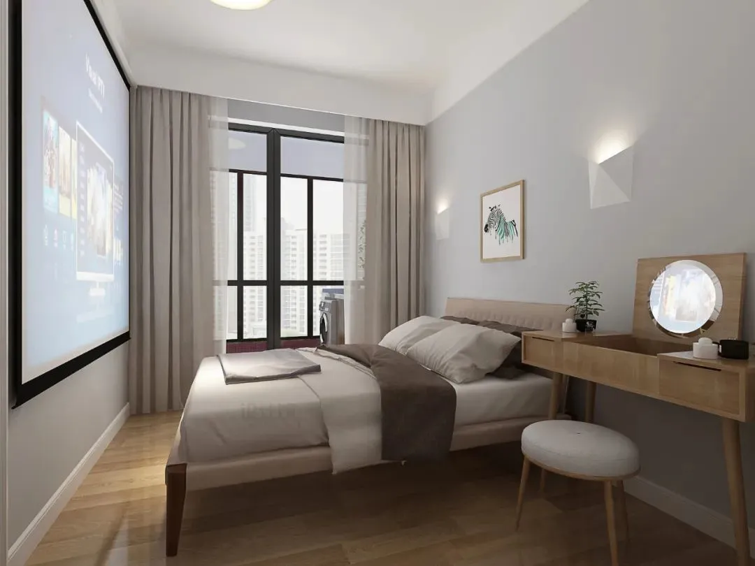 If the bedroom space is really limited and you want a large screen experience, you can consider installing a projector. The projection can be directly projected on the white wall or white cabinet door, and the electric curtain can also be hidden and installed in the ceiling, which has little impact on the layout of the bedroom.
