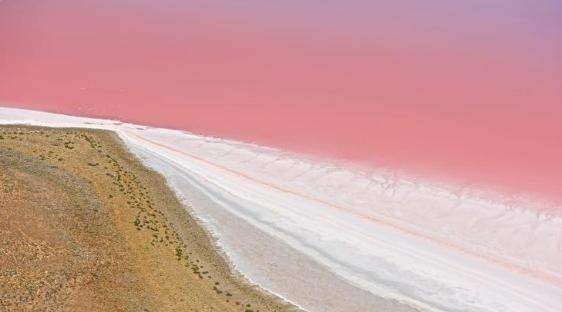 The color of Lake * is determined by beta-carotene produced by halophilic algae in the lake. High temperatures, intense light, and water evaporation will enhance algae activity and make the pink color more vibrant.