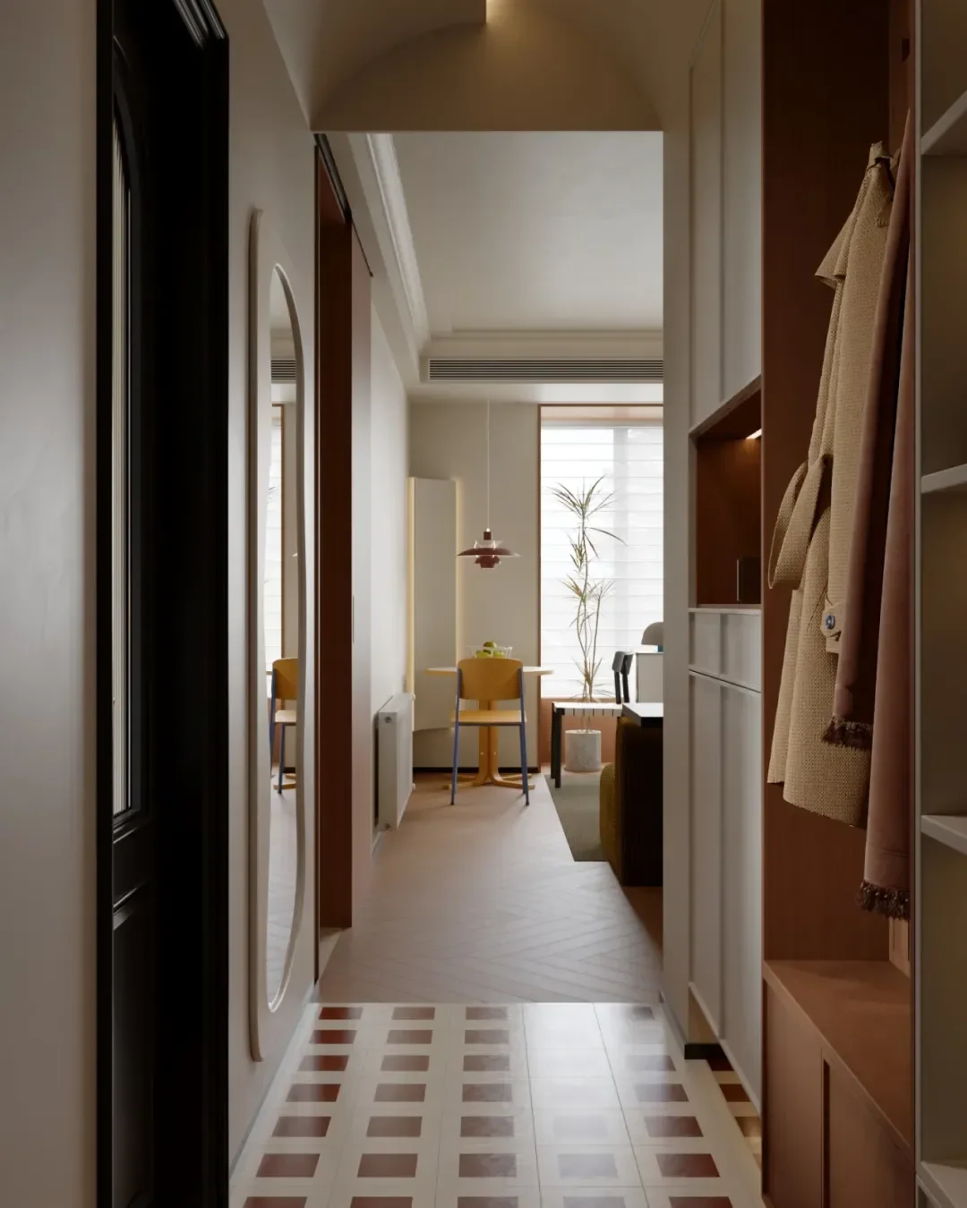 There is a full-length mirror hung on the opposite side, which is convenient for tidying up your appearance before going out.