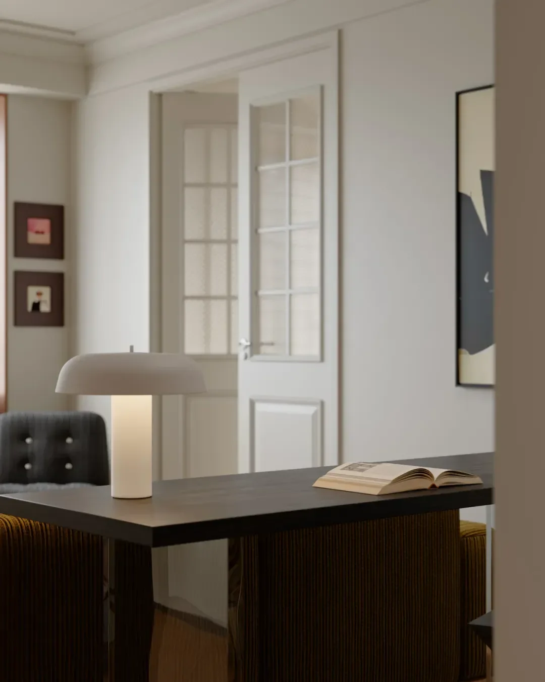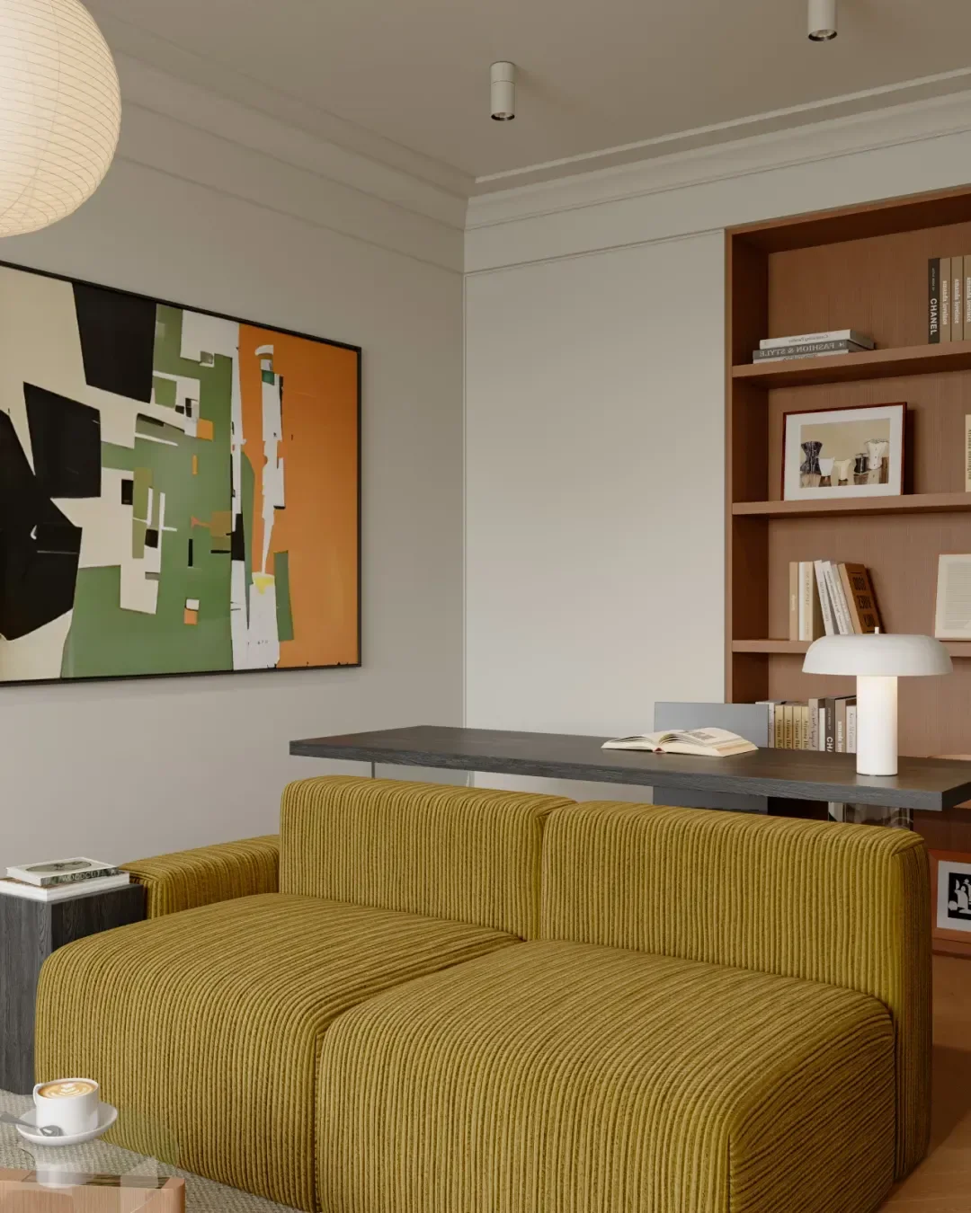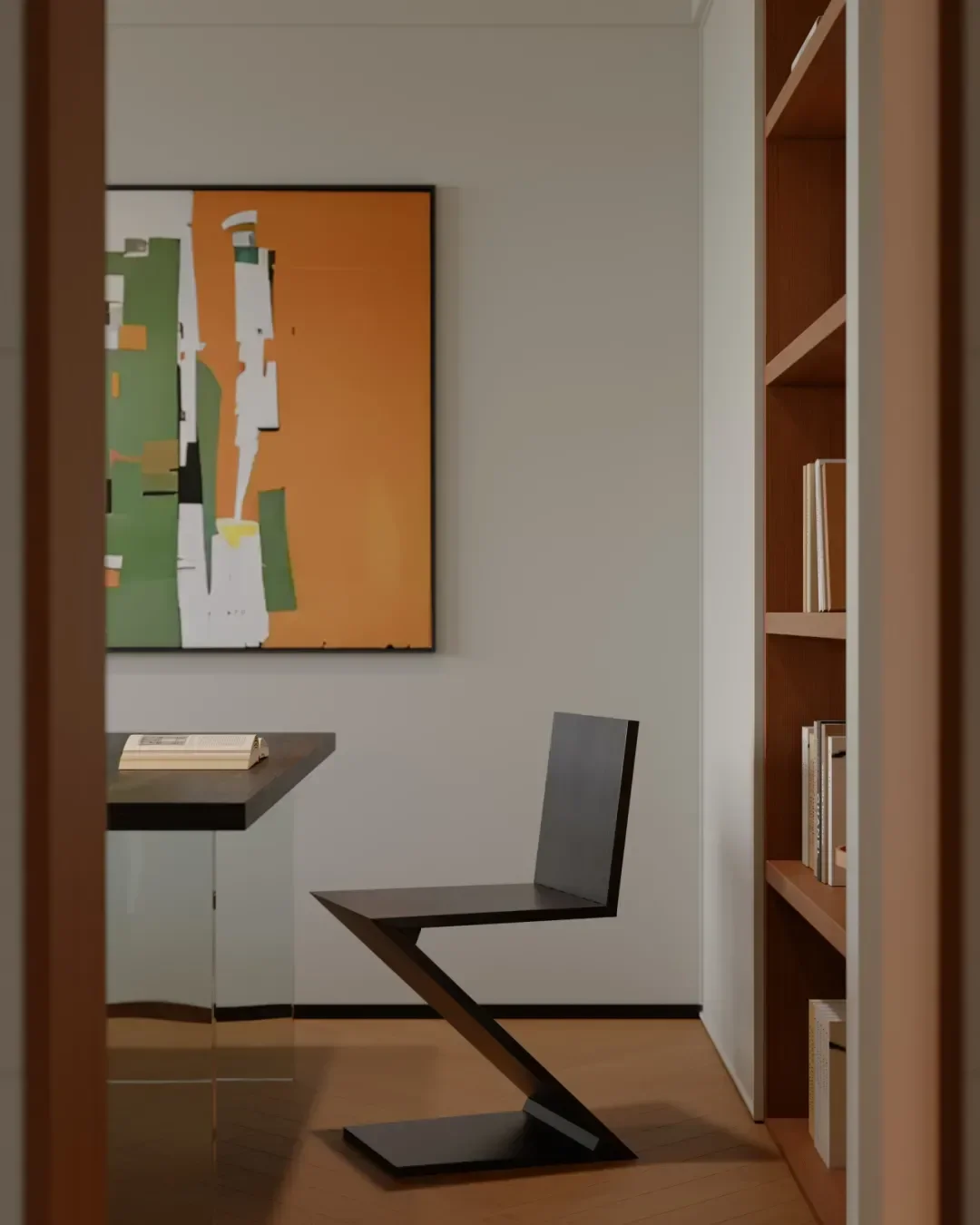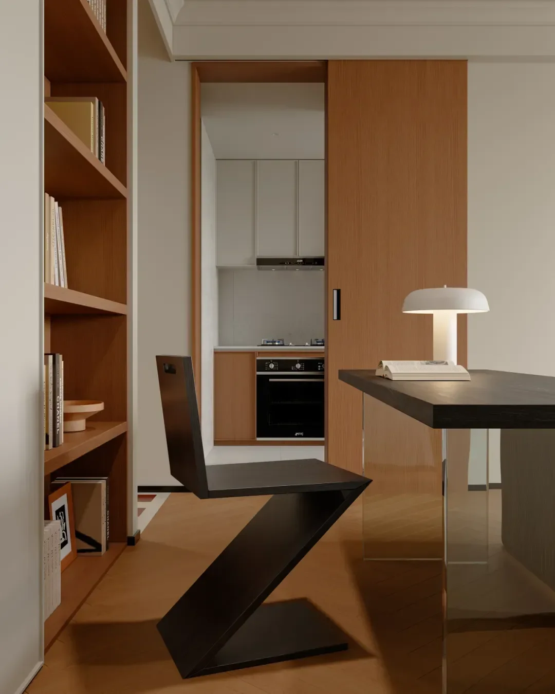 In front of the bookcase, a single chair, a desk and a small desk lamp form a quiet reading corner, so that people can immerse themselves in the fragrance of books.
