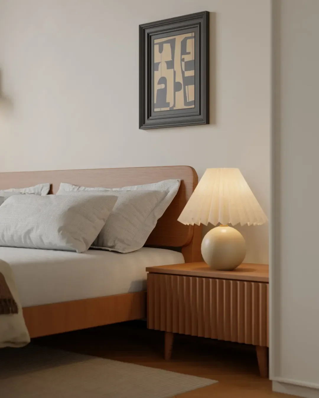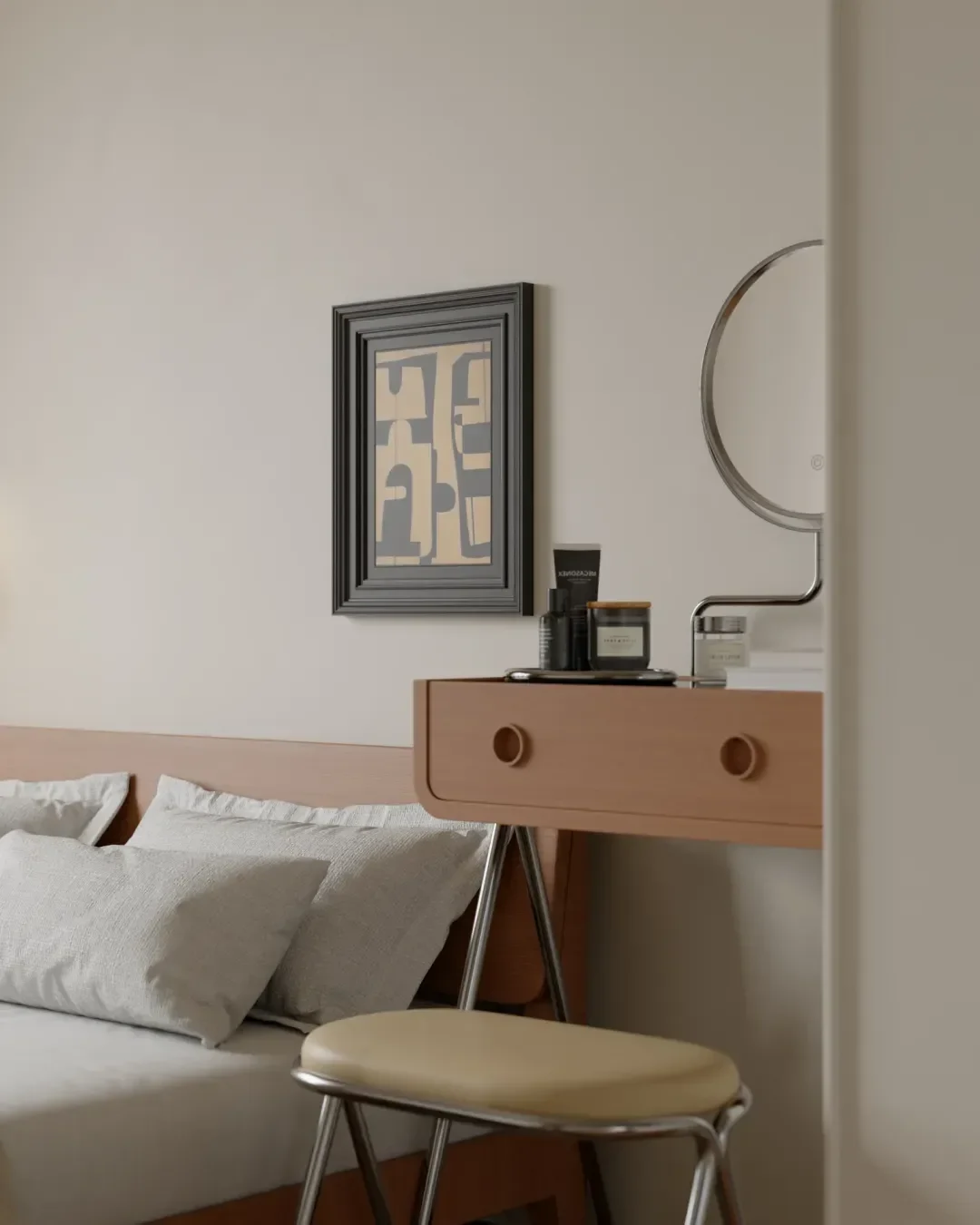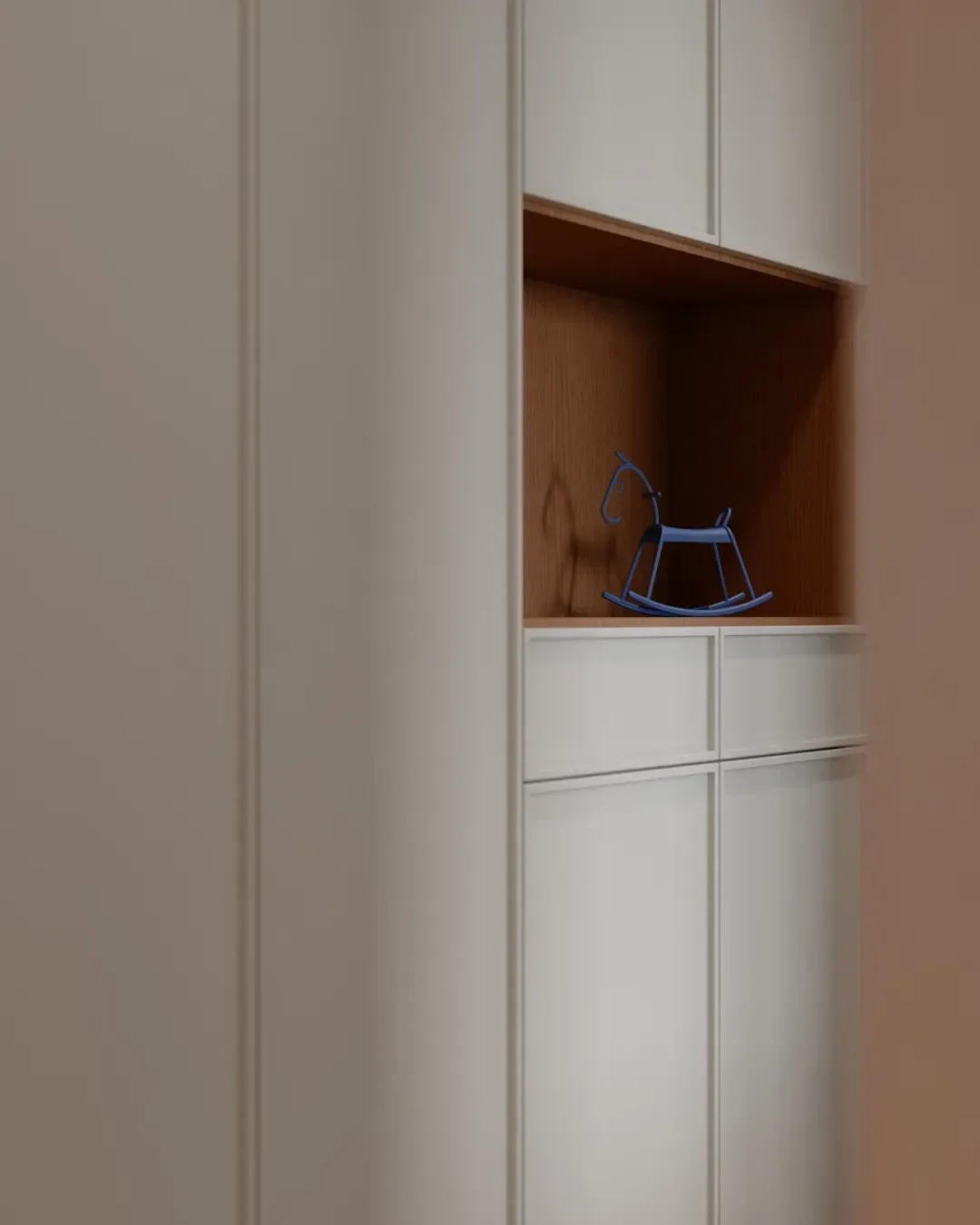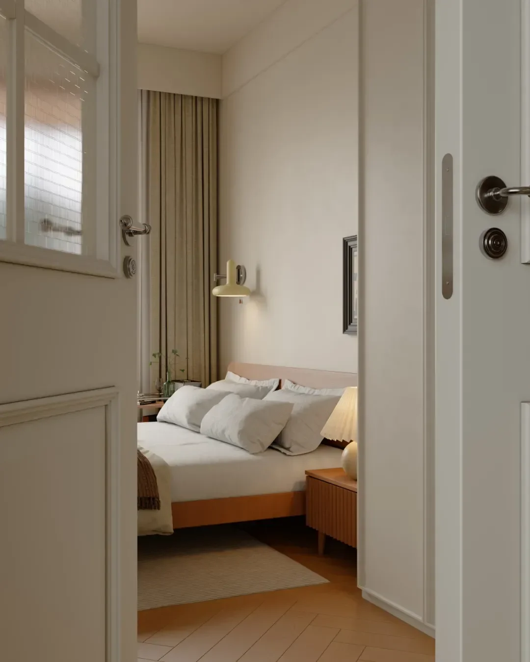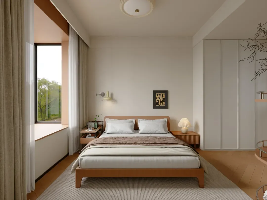 The bedrooms are decorated in uniform pastel tones. Storage cabinets are added on both sides, and the double-door design greatly expands the storage capacity, keeping the bedroom spacious and tidy.
