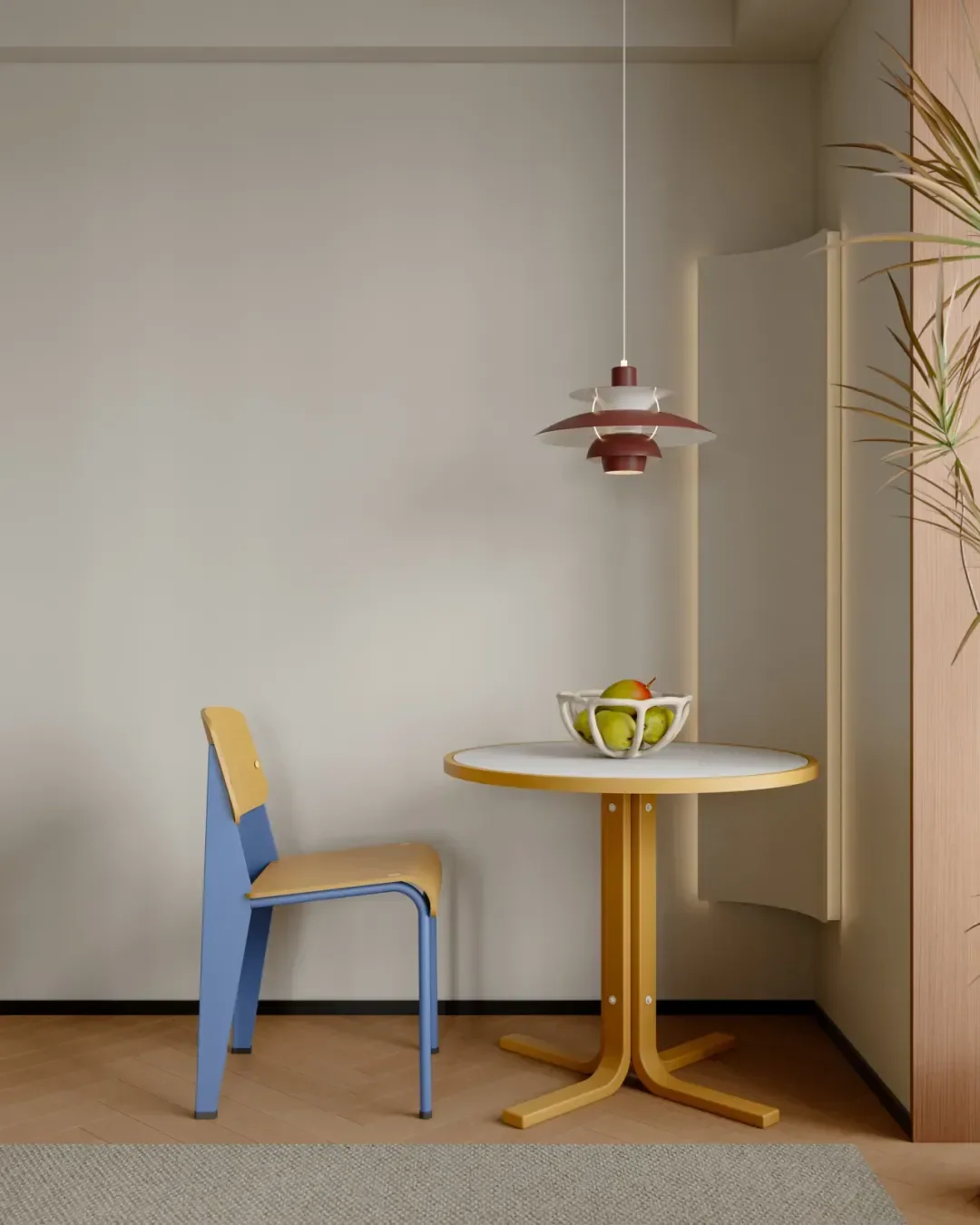 A small round table is matched with a high-value blue dining chair. This small corner is the dining area dedicated to the owner.