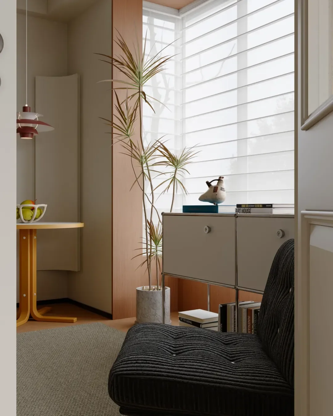 The green plants dotted in between inject a touch of natural vitality into the quiet space. This private and reassuring little world is the ideal home to relax after work.