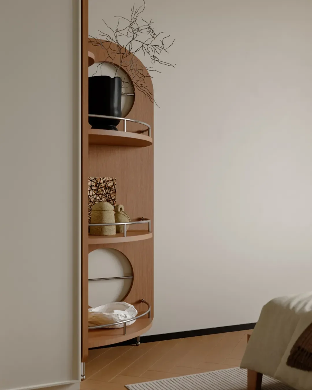The owner of this case is a lady living alone who loves reading. She loves the warm and harmonious home atmosphere, and hopes that her home will not only have perfect functions and comfortable layout, but also be visually pleasant, and the moving lines of daily life should be smooth and natural.
