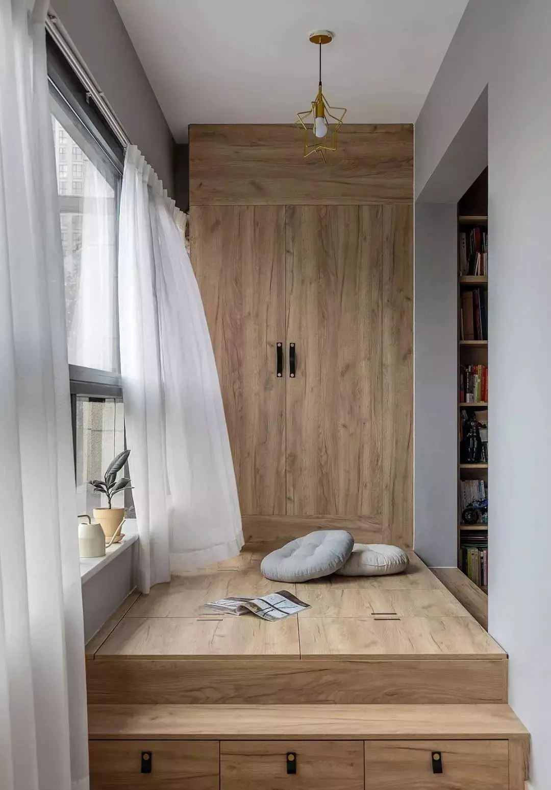 Friends who like to drink tea can raise the balcony floor slightly and put a small tea table to make it a Japanese style. Whether you are drinking tea alone or entertaining friends, you can drink tea here and enjoy the scenery outside the window, which is quite pleasant.