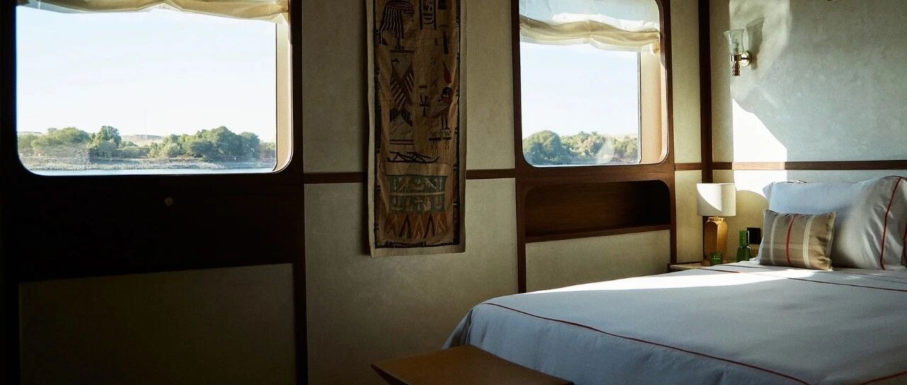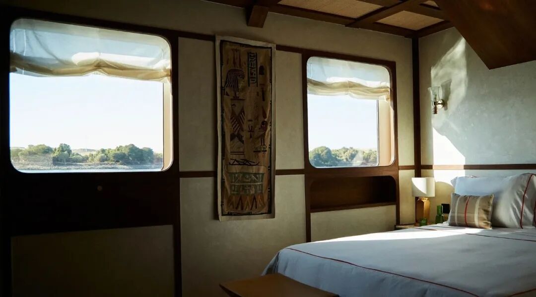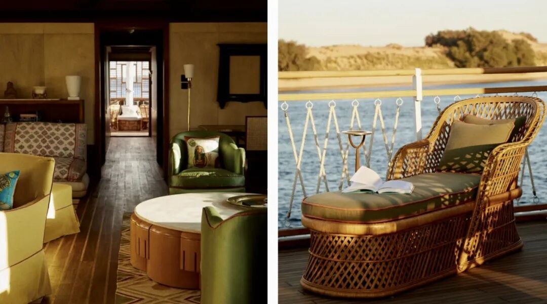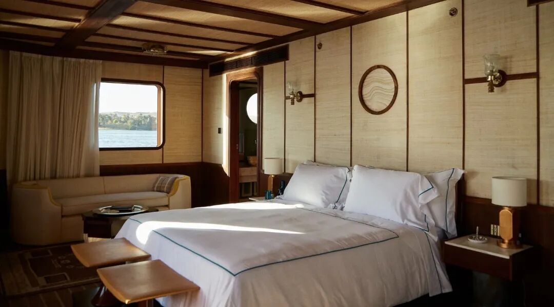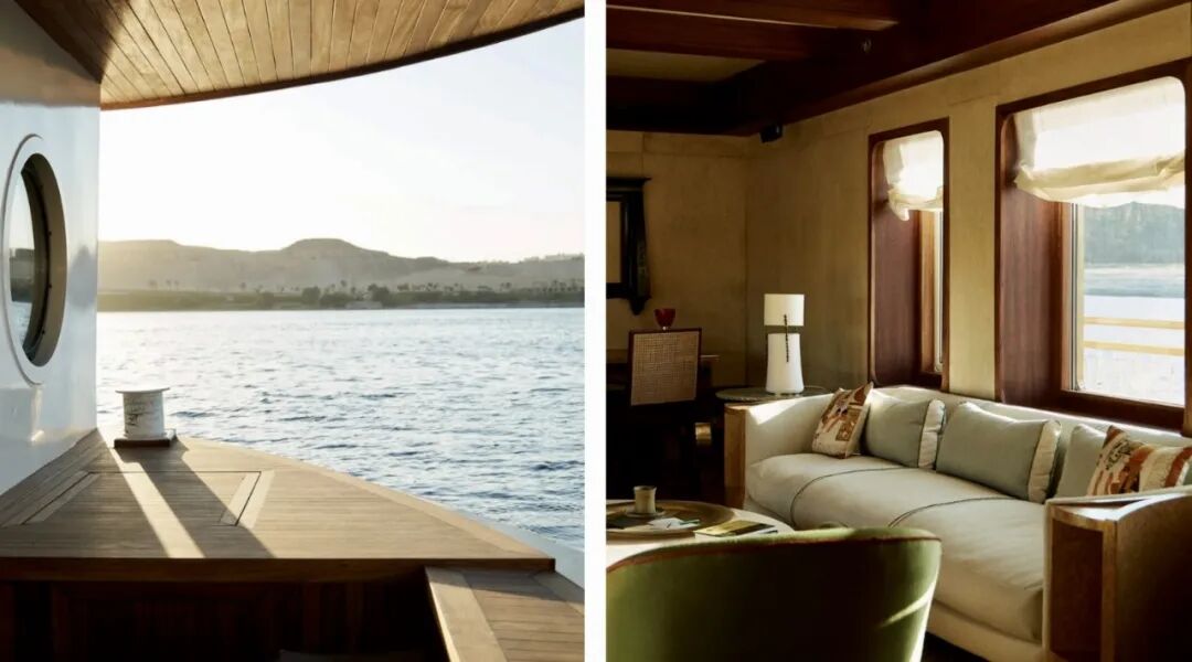 Every dusk, as the sun slowly sinks behind the huge stone pillars of Luxor Temple, the pigeons perched in the niches between the pillars will take off on time. They draw a “V” in the coral sky, circling along the skyline, circling and circling the most important religious shrine of ancient Egypt. Following the track of the pigeons, my eyes landed on the “Avenue of the Gods” connecting Luxor Temple to Karnak Temple. On both sides of the avenue, solemn statues of ram heads silently guarded. On distant festivals, ancient Egyptians used to follow this path, thanking the generous gifts of the Nile and performing sacred rituals. When we walk through the banks of the Nile River, those temples standing among the river beaches, sand dunes and green fields all show the wisdom and piety of ancient Egyptians beyond the times. Even in the mausoleum 200 meters underground and composed of hundreds of tombs, every carving on the wall is still exquisite, without any compromise. Time flies, and the Zahra, a brig with a 50-meter-high mast, is trying to reproduce that extraordinary spirituality and aesthetics in contemporary design language. It was created by local Egyptian designers and invested by local rich people, symbolizing the “comeback” of the glory of ancient Egypt in modern times. Every corner of the ship is a tribute to ancient Egyptian civilization: from the drawer wrapped in papyrus to the tapestry hanging in the cabin; From the embroidery depicting panoramic views of the Nile, to the starry ceiling that echoes the tomb of Seti I. Almost all the objects on board were made by Egyptian craftsmen: teak floors, hand-woven carpets, carved plaster washbasins, Hermes cushions inspired by ancient Egyptian symbols, and even dining table inlays all borrowed from the decoration of the tombs in the Valley of the Kings. There is also a sauna hidden on the main deck, and the study is like a desert oasis outside the living room. The ship accommodates up to 12 guests and features four double cabins and two suites. What’s special is that all cabins are located below the waterline, so you’ll wake up with a view level with the Nile. In the days of the Pharaohs, it was believed that ships could carry light across the sky and bring the gods to earth. Staying here seems to have experienced such a sacred journey. Tranquility is the main theme of the 200 km voyage from Luxor to Aswan. The Yale has no roar of engines and is only towed silently by a tugboat. At night she moored beside secluded islands; Early in the morning, you will wake up to the sound of birdsong or buffalo calls in the river. 🕳