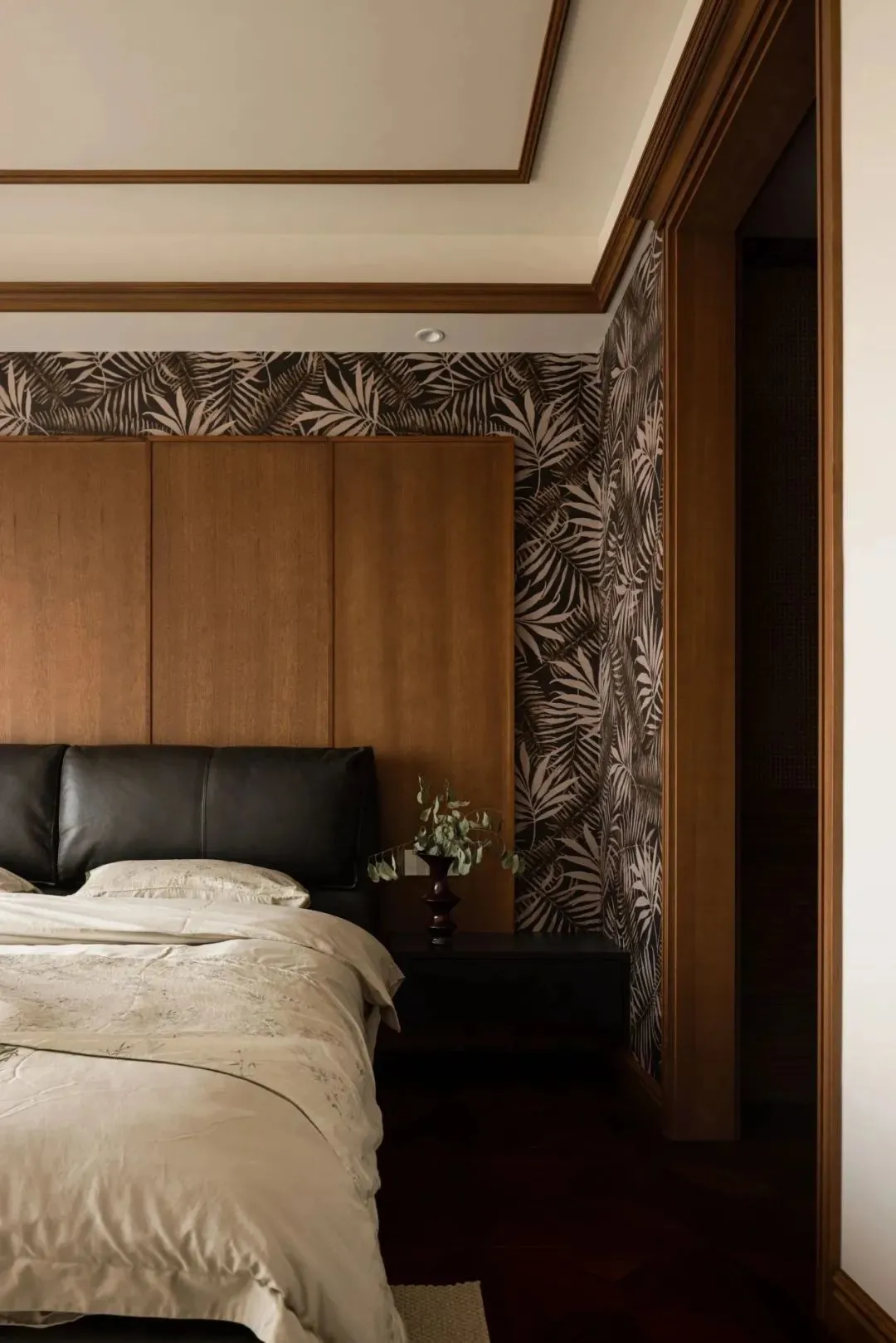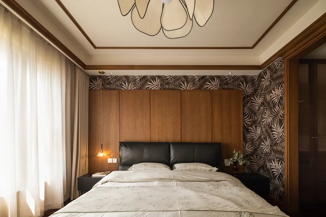 The bedroom continues the overall medieval tone. With mottled palm leaf wall covering as the background and wooden wainscoting, the simple and elegant furnishings are like slowly flowing clear water, gently infiltrating dreams. It seems that you can smell the sweetness of rice in the space, which makes people gradually relax and yearn for it. The rich autumn atmosphere quietly pervades here.