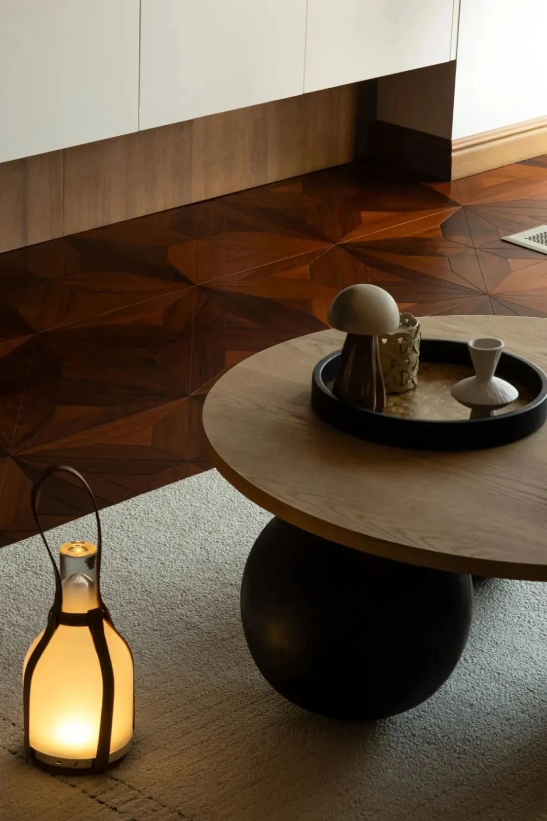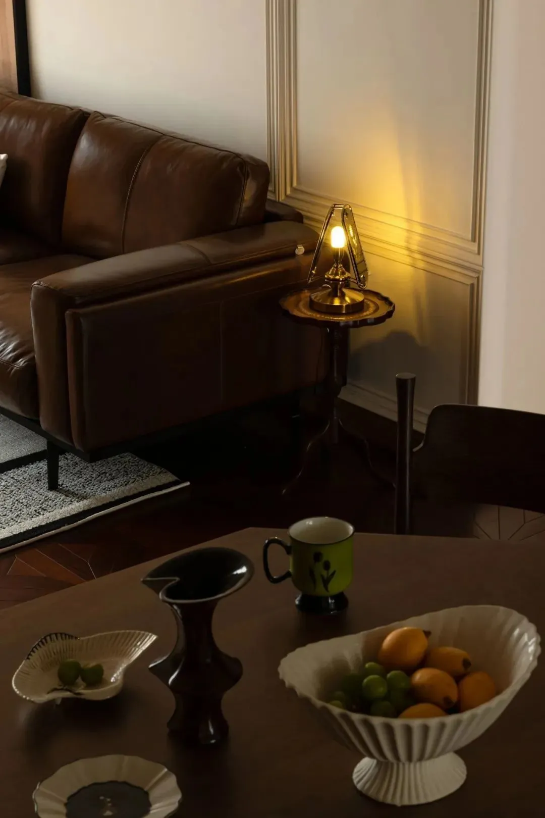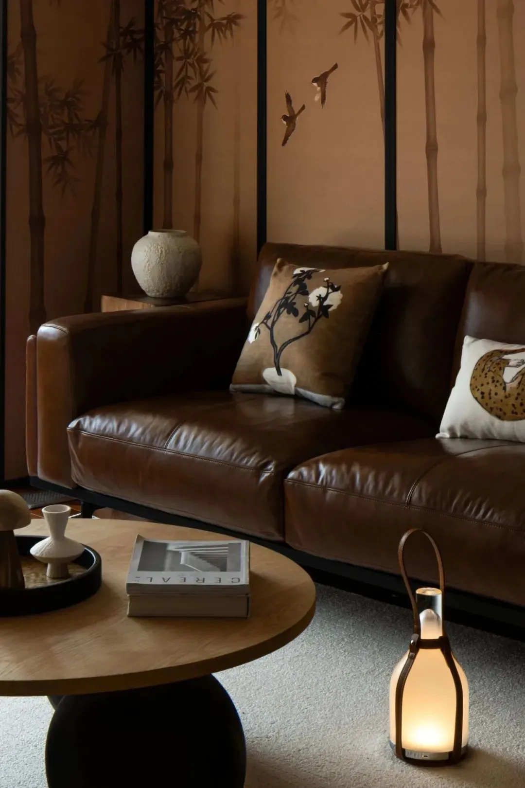 The living room is decorated with dark brown leather sofa, solid wood ball coffee table and leather portable creative lamp. Against the background of carpet and warm sunshine, all kinds of objects together create a leisurely and relaxed atmosphere.