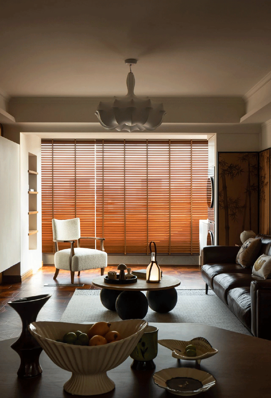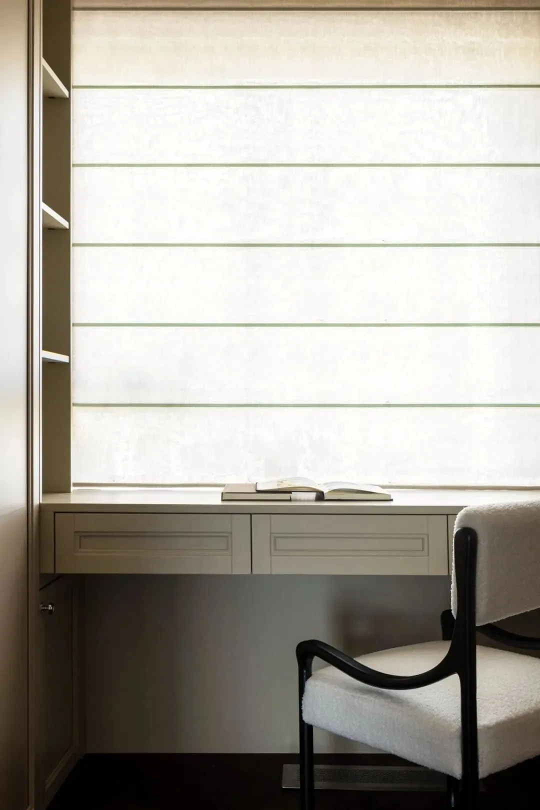The suspended desk is customized by the window, which is convenient for reading or occasionally working from home. A roll of bamboo curtain can not only adjust the light, but also add a bit of interest to the space.