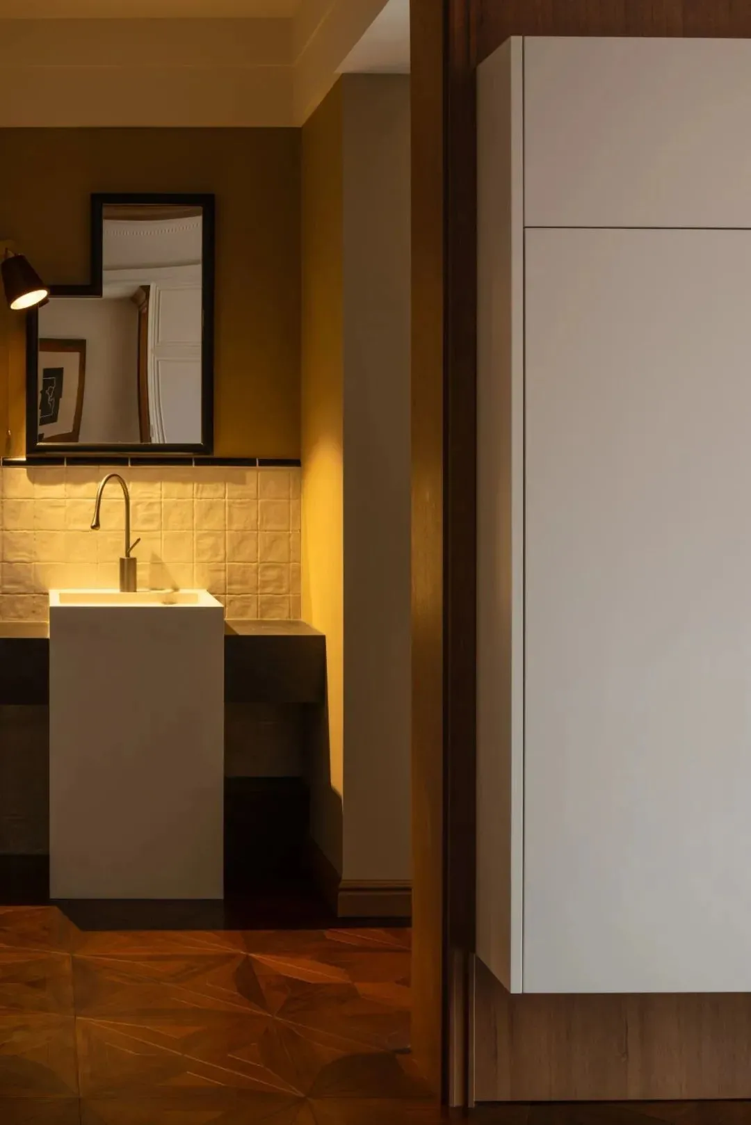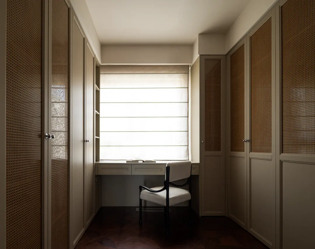 In the aisle between the master bedroom and the main bathroom, two groups of cabinets are customized to form a walk-in cloakroom, which fully meets the storage needs. The whole wall cabinet door combines retro logs, rattan, louvers and glass elements, which improves the storage aesthetics of the space.