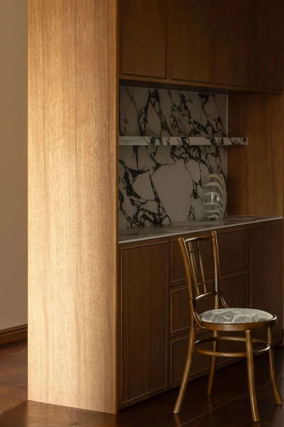 A set of sideboards is customized by using the beam structure, which can not only meet the storage needs, but also play the role of space partition. In the four-section layout, the combination of rock slab and log materials shows the diverse aesthetic feeling of the space.