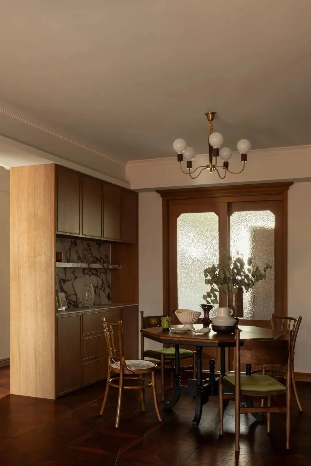 The vintage cherry wood octagonal table, with black Roman column legs, reveals a calm medieval charm. A brass magic bean chandelier echoes the solid wood dining table-this world is not reserved to the outside world, but only prepared for family reunion.