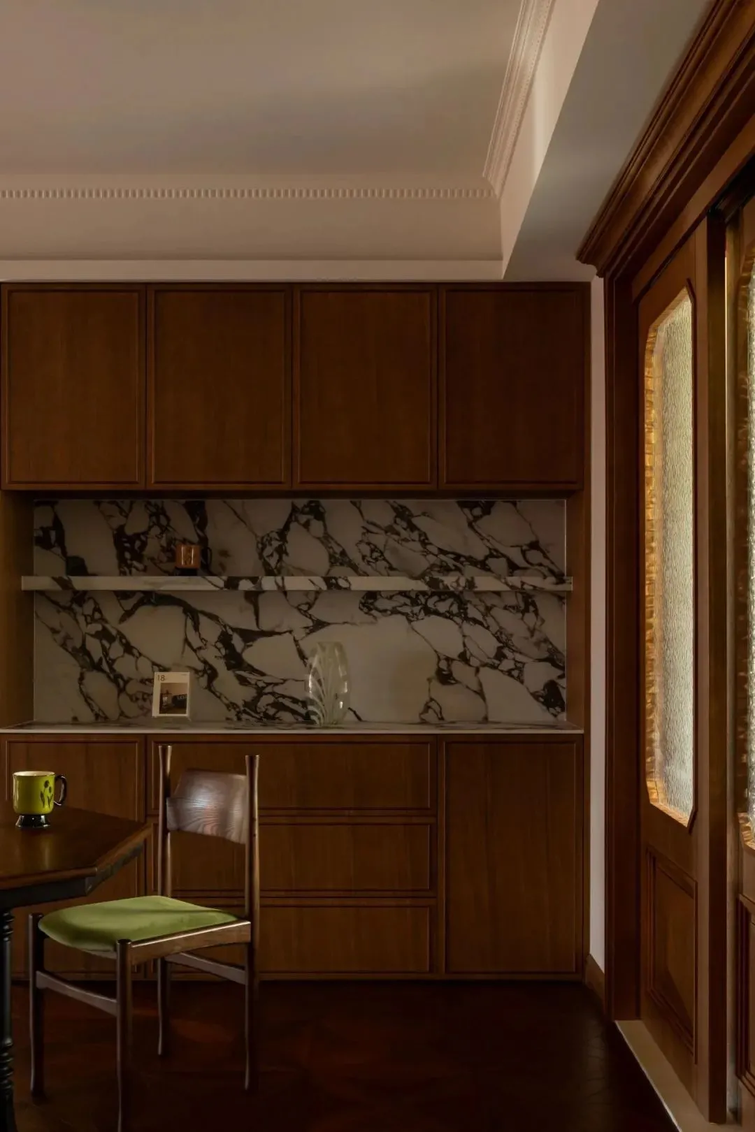 The dining room is close to the kitchen, and the moving line is short and quick, which is convenient for daily use. A water corrugated glass door effectively isolates cooking fumes.
