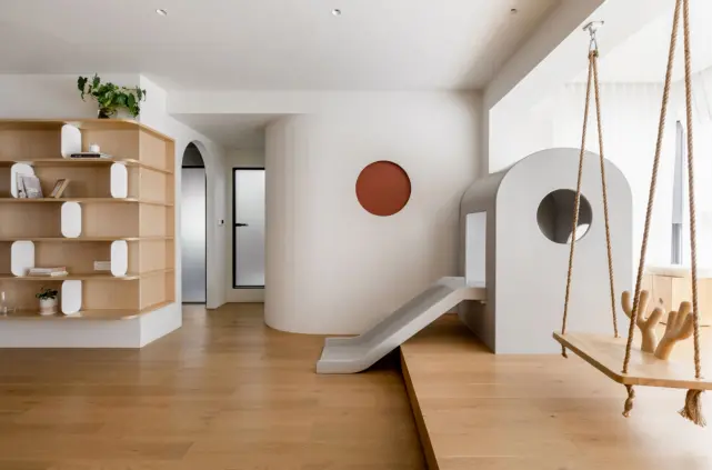 Transform the living room into a playground without TV: if the floor is tiled, it is recommended to lay a carpet (wooden flooring can be decided according to personal preference); On the wall next to it, cabinets for storing toys can be designed, and children’s amusement facilities such as small slides and ocean balls can be placed, so that children can have a free world to release their nature.