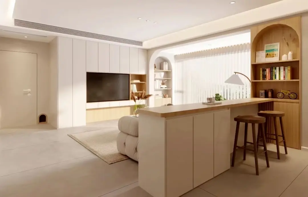 If the living room area is large, a part of the space can be divided into a tea bar area for reading and resting. When used with the whole wall storage cabinet, books and storage can be easily handled.