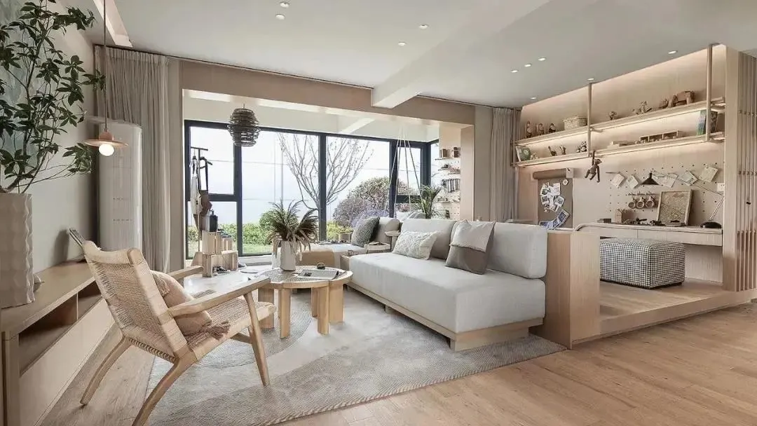 Create a storage background wall behind the sofa, which can not only decorate the space, but also meet the storage needs.