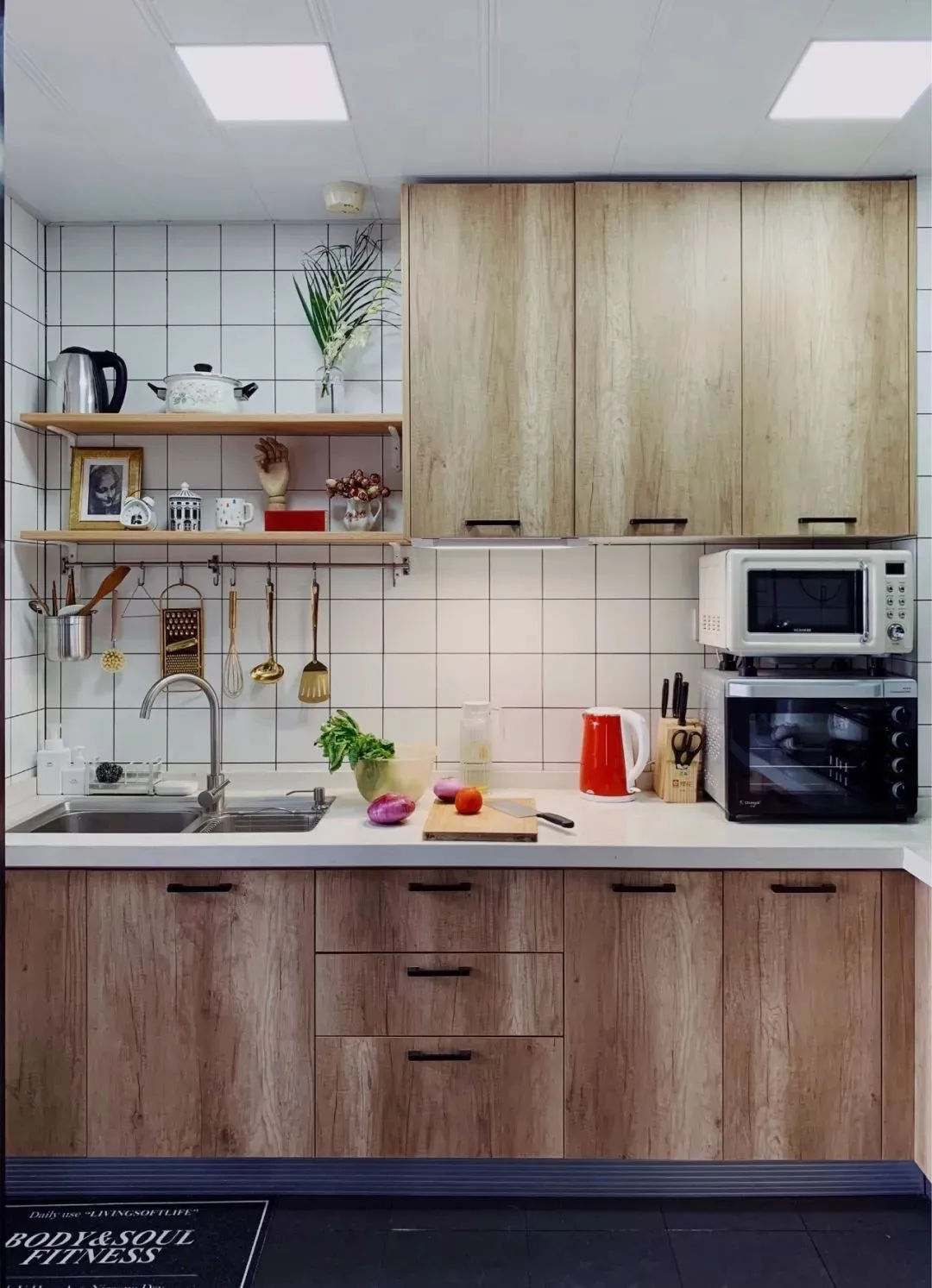 Try to install more shelves on the wall. In this way, commonly used items can be stored on the wall, avoiding all of them being piled up on the countertop, thus leaving more valuable operating space.